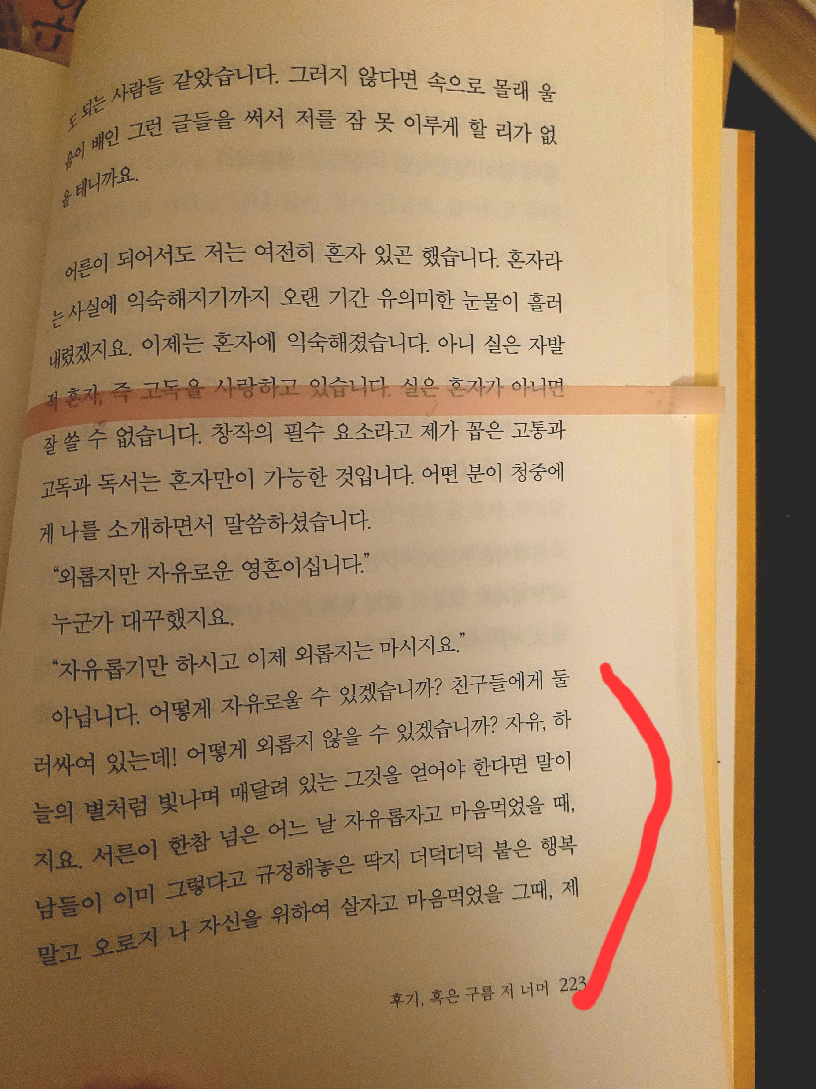 “. . .죽고 싶었지만 신기하게도 진짜로 죽으려는 생각은 하지 않았어요. 이상하게 운명에 대한 대결 같은 거. 그것은 맞서는 대결이 아니라 한번 껴안아보려는 그런 대결이었는데, 말하자면 풍랑을 당한 배가 그 풍랑을 이기고 가는 유일한 방법은 그 풍랑을 타고 넘어가는 것 같은 그런 종류의 대결……내게 이것을 가르쳐준 것은 글이었는데 글은 모든 사람의 가슴에서 넘치다가 엎질러져 나오는 것이고 그렇게 엎질러져 나온 글들은 상처처럼 빨간 속살에서 터져나온 석류 알처럼 우리를 기르고 구원하니까요, 했더라구”
